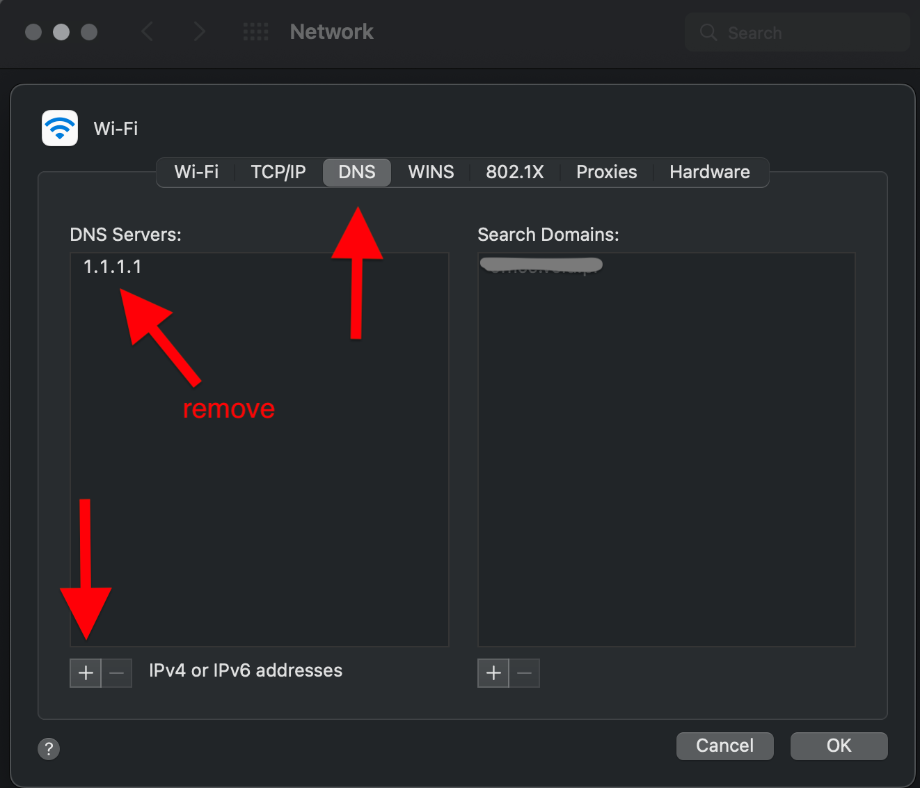 4. Click on DNS on the top section. Then click on the DNS Server IP and remove it with the - (minus) button below.